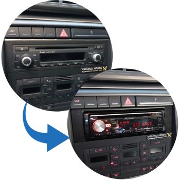 1-DIN radioadapter for å bygge om interiøret i en en spesifikk bilmodell til standard DIN-hull slik at man kan montere valgfri ettermarkedsradio i samme størrelse istedenfor den originalmonterte radioen.