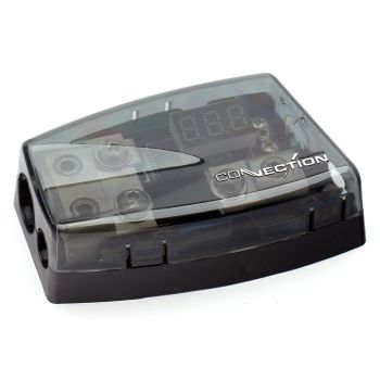Distribusjonsblokk/strømfordeler i Connections First-serie. Dekselet er produsert i eksklusiv ripefri og kraftig polykarbonat termoplast mens de kraftige selve blokken er produsert i messing. Tilkoblinger: 1x 25mm2, 4x10mm2.